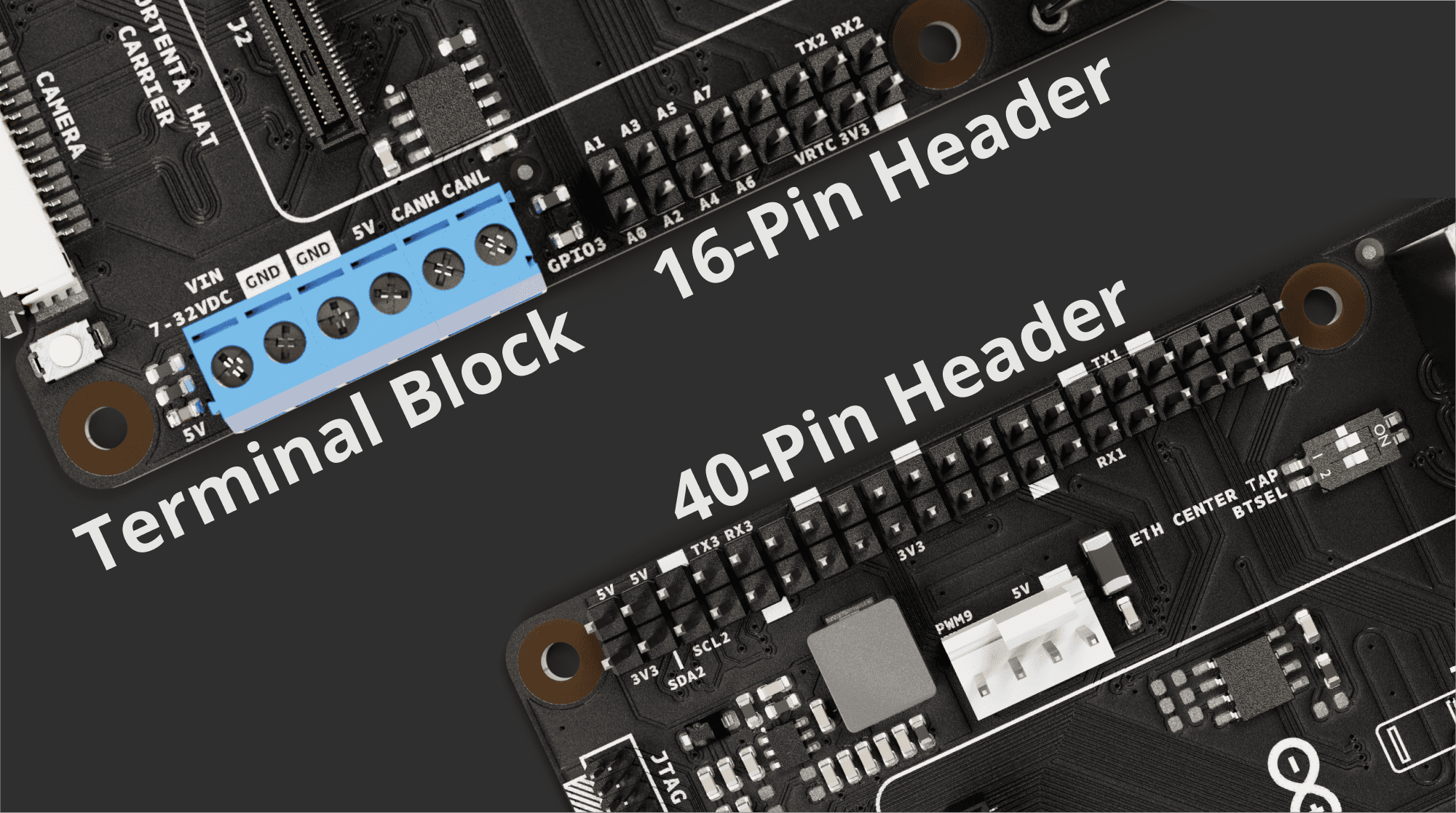 Screw terminal block: The terminal block allows power supply line feed for the carrier and bus ports. It consists of VIN 7 ~ 32 VDC (x1), VIN 5 V (x1), CANH (x1), CANL (x1), and GND (x2).